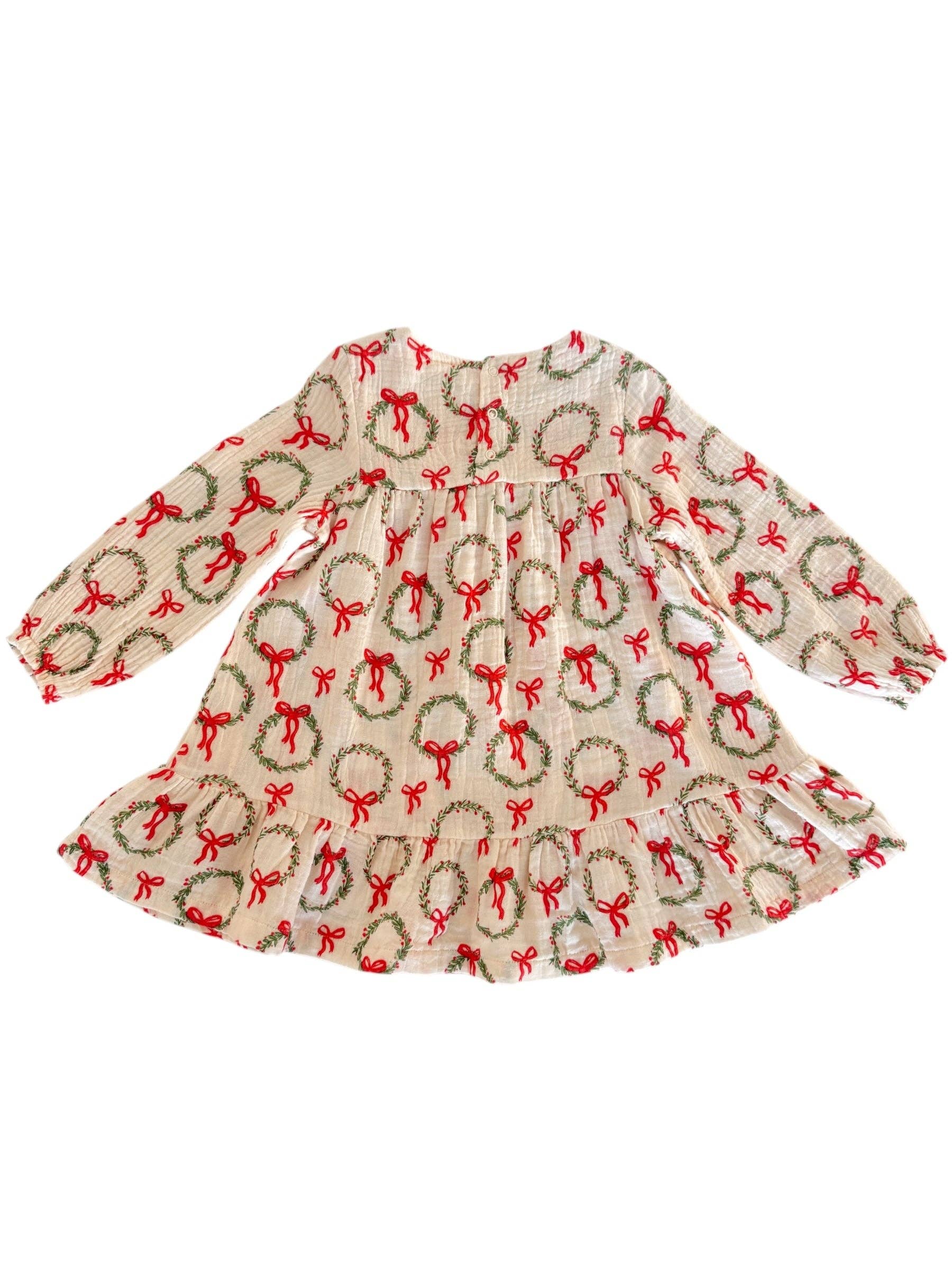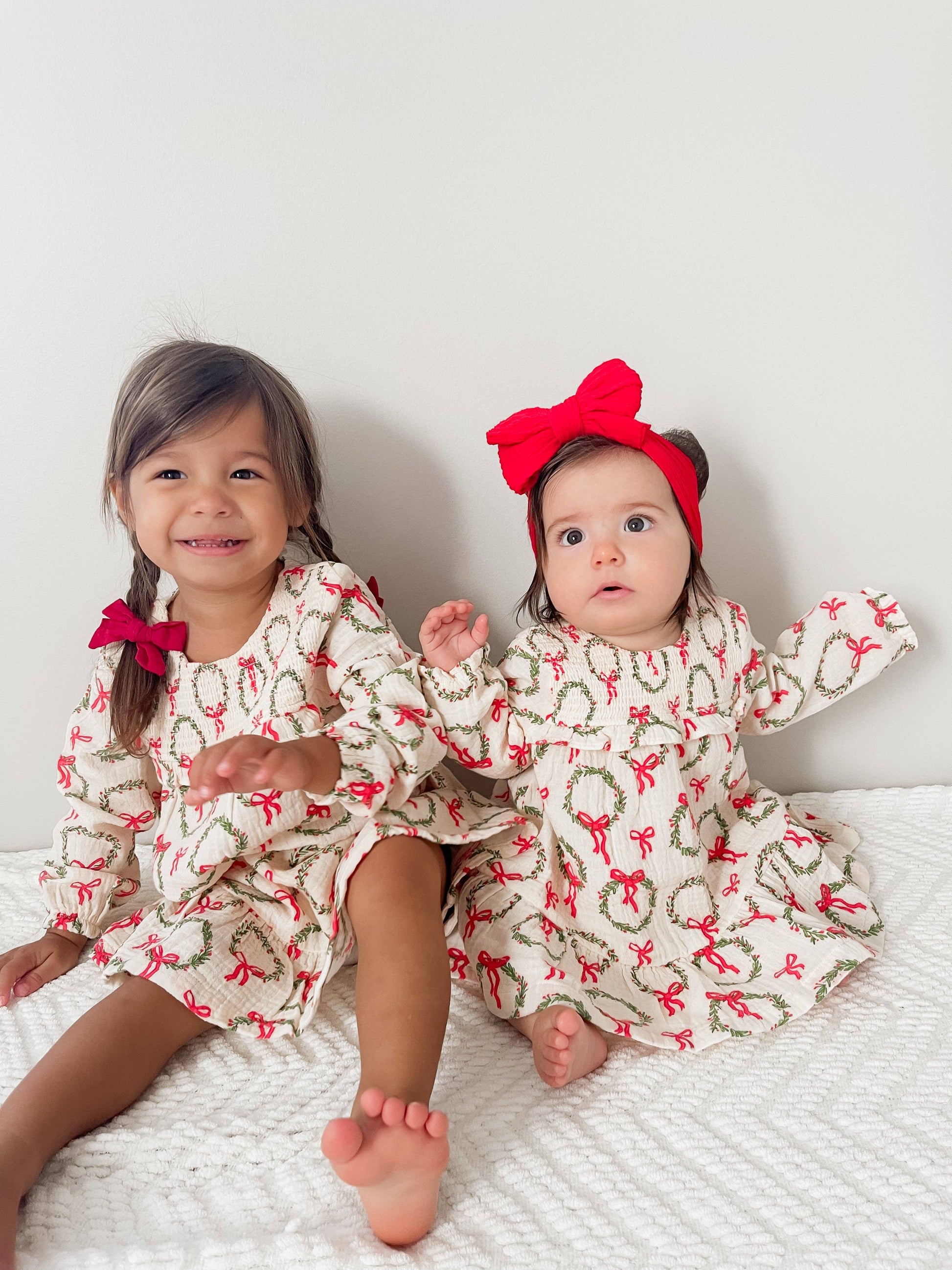 Celebrate the season in style with our Smocked Ruffle Tiered Dress in the charming Wreath print. Designed for kids (2Y - 8Y), this festive holiday dress is perfect for matching with the baby dress & bloomer set for sweet sibling looks. The soft, breathable 100% organic cotton muslin keeps them comfortable all day, while the smocked bodice and tiered ruffles add just the right amount of charm.