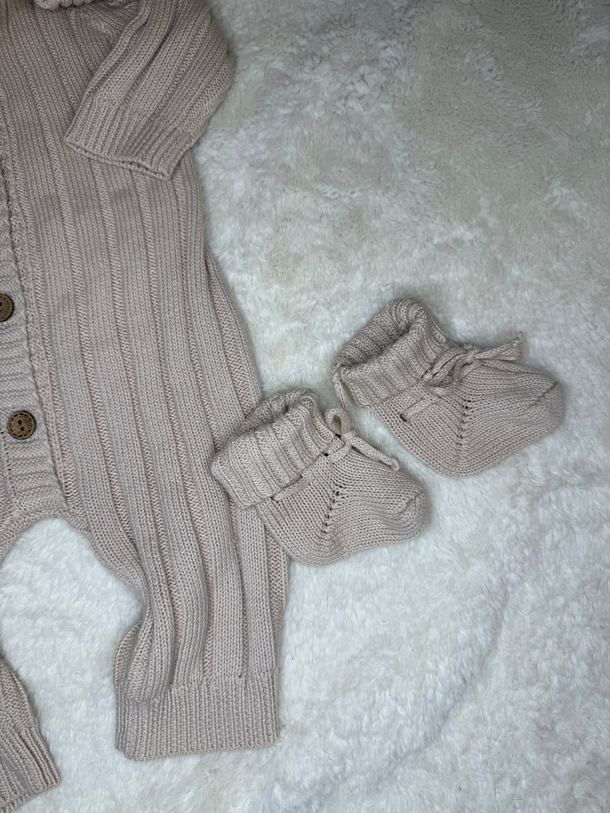 Soft Cotton knit Baby jumper, perfect for your little one's take-home outfit, memorable photography sessions. Made with 100% cotton, these jumpers provide comfort and style for your baby. This gender-neutral knit romper is the perfect outfit for your little one, made from 100% cotton yarn. What color is Taupe? Taupe is a cooler hue of oatmeal. Features Soft, breathable cotton knit Functional front buttons Ribbed cuffs for a snug fit