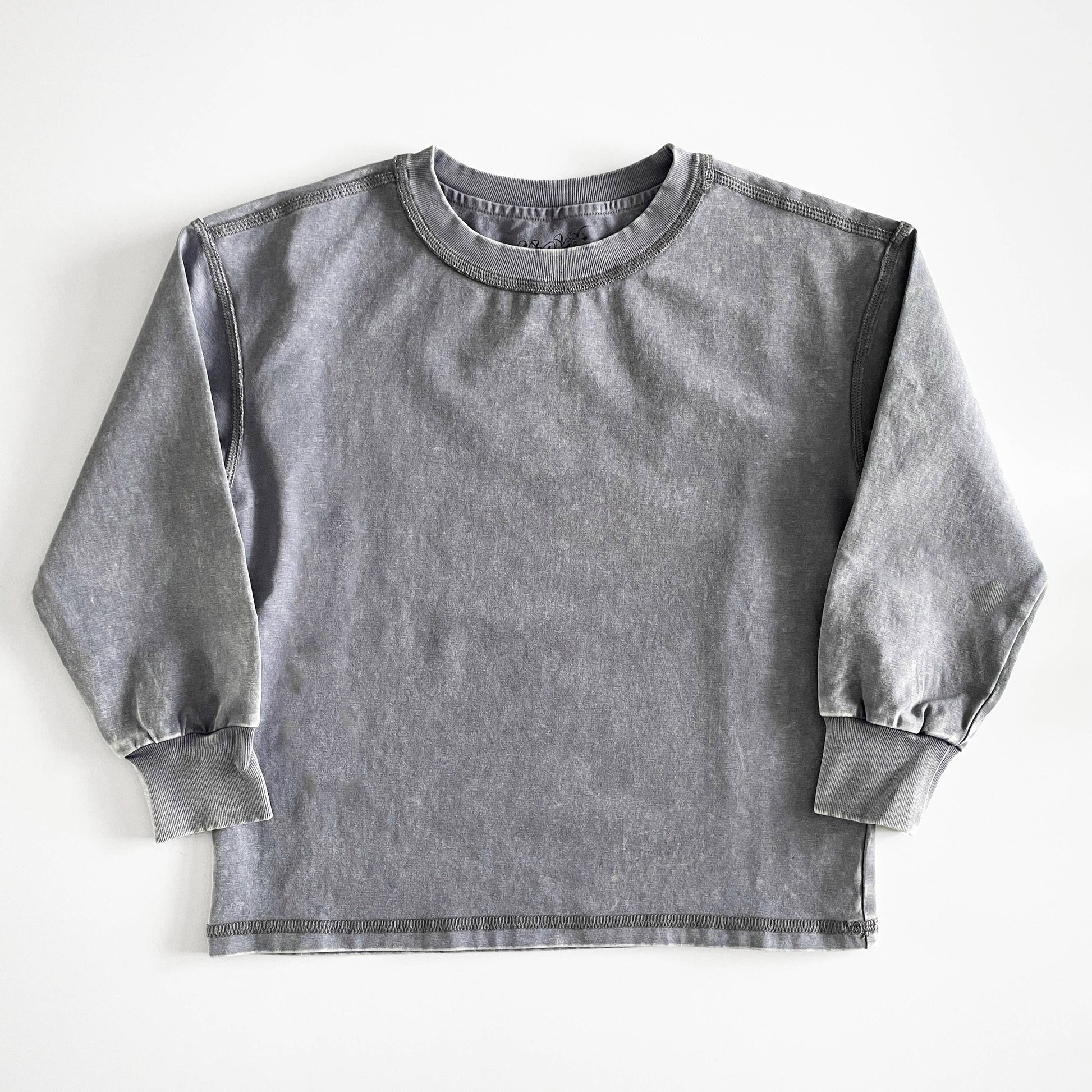 Introducing our Classic Long-Sleeve Tee, featuring inside-out seaming and a stone wash finish. This style is in a beautiful grey hue with a blue undertone.